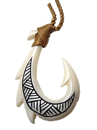 Carved Bone Hawaiian Tribal Tattoo Fish Hook Pendant At